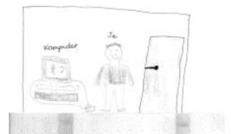 La investigación concluyó que la mayoría de los niños entrevistados consideran que su lugar de origen es más importante en relación con el país de acogida, ya que el sentido de pertenencia y el significado que les aporta su lugar de origen es esencial. El dibujo de abajo pertenece a Matthew (8 años), que dibujó su experiencia en su nuevo hogar. Como se puede ver, el niño aparece en su habitación, utilizando su ordenador. En la pantalla del ordenador hay un teléfono y una persona (Figura 4, p.35).