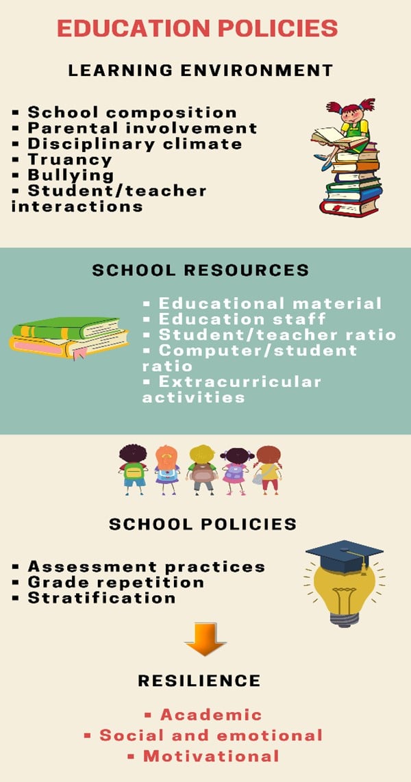 El sistema educativo, los recursos y el equipamiento que ofrecen las escuelas, la calidad y la cantidad de los profesionales de la escuela, las actividades extraescolares y la cantidad de tiempo de aprendizaje parecen ser significativos en lo que respecta a la participación de los estudiantes inmigrantes en el proceso de aprendizaje y mejora de su condicionamiento pedagógico (OCDE y PISA, 2018, p.191). La OCDE y PISA han desarrollado un diagrama para explicar cómo se puede promover eficazmente la resilencia de los estudiantes inmigrantes a través de diversas políticas educativas, centrando la atención en tres componentes clave, el entorno de aprendizaje, los recursos escolares y las políticas escolares.