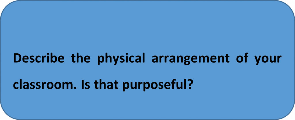 Profesor: “Sí, definitivamente, no es al azar. Primero hablemos de cómo agrupo mi clase y de la ubicación física. La disposición física es intencionada. Están sentados en equipos, y creo que eso es importante. Los alumnos trabajan en equipos y los pupitres están agrupados de forma que trabajan en colaboración. La disposición física del aula es tal que no hay nada que me bloquee la vista desde ningún punto de la sala. Puedo ver la estantería, el equipo del fondo, etc., así que puedo mirar hacia arriba y hacer comentarios y opiniones” (Profesor de María).