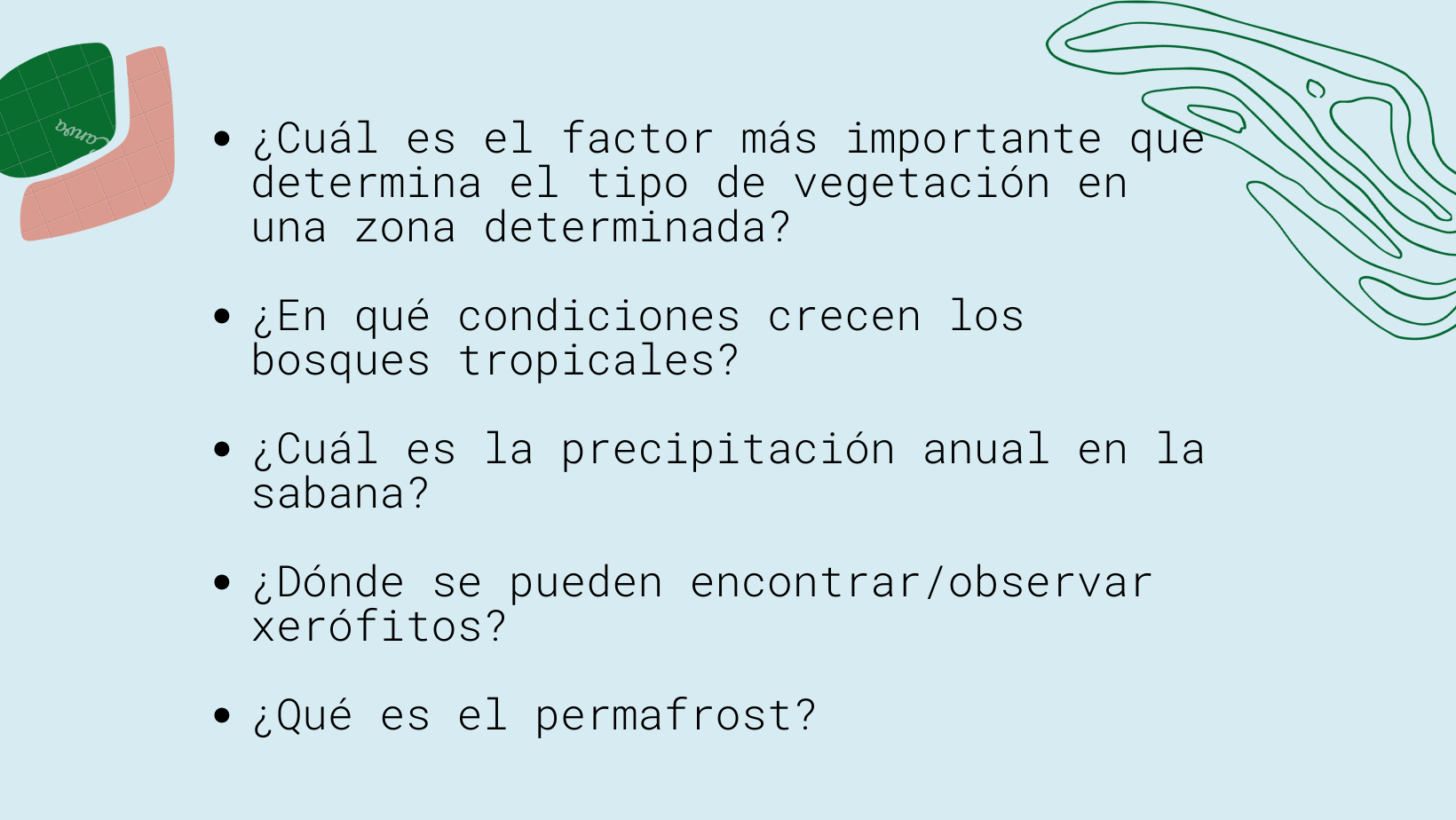 En la siguiente parte de la lección, los alumnos recibieron una breve lista de preguntas en inglés sobre las zonas de vegetación. Trabajando en parejas y de tres en tres, debían responder a las preguntas en inglés. Por supuesto, volvieron a utilizar libremente la estrategia de trans lenguaje mientras elaboraban las respuestas. La diapositiva principal presentada por el profesor resultó muy útil. Las preguntas eran las siguientes: