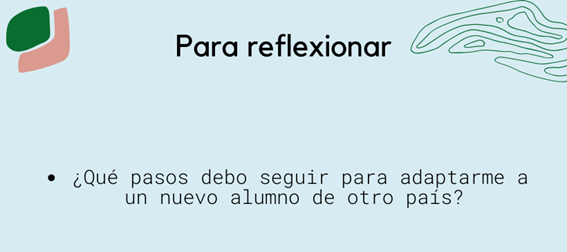 Cuando se empieza a trabajar con un alumno procedente de otro país o que regresa a su país de origen, es muy aconsejable establecer una relación positiva con el alumno desde el principio, así como conocer su situación. Un diagnóstico preciso del alumno ayudará al profesor a planificar un plan de adaptación individual adecuado.