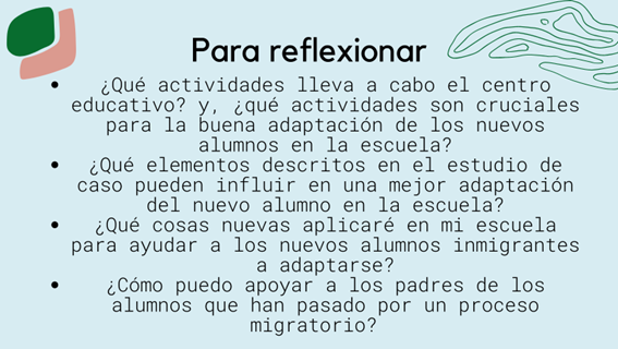 Los profesores que trabajan con un alumno extranjero/de origen inmigrante deben implicar a los padres del alumno y acordar juntos las acciones del proceso de adaptación y la responsabilidad de su aplicación. El éxito de este proceso depende de la complementariedad entre profesores y padres (Comisión Europea/EACEA/Eurydice 2019; Lea, 2012).